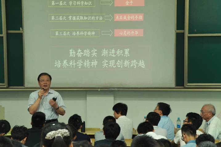 915日,理学院2014级新生迎新会在第一教学楼1137教室举行,中国科学院院士、我校理学院院长褚君浩为新生讲授了题为《远志、勤奋、好奇、美德》的讲座。理学院常务副院长张菁,党总支书记陈小立以及多名学院负责同志和教授出席了本次迎新会。