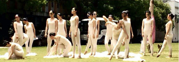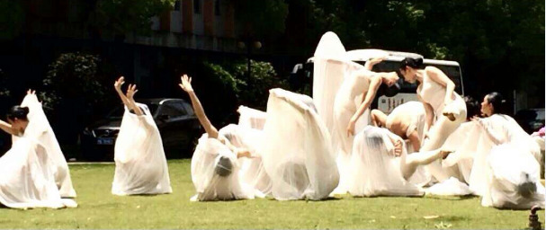527日,在延安路校区第三教学楼前的草地上和松江校区一食堂门前,我校学生艺术团舞蹈团成功上演舞蹈《蜕》,吸引了众多师生驻足观看。