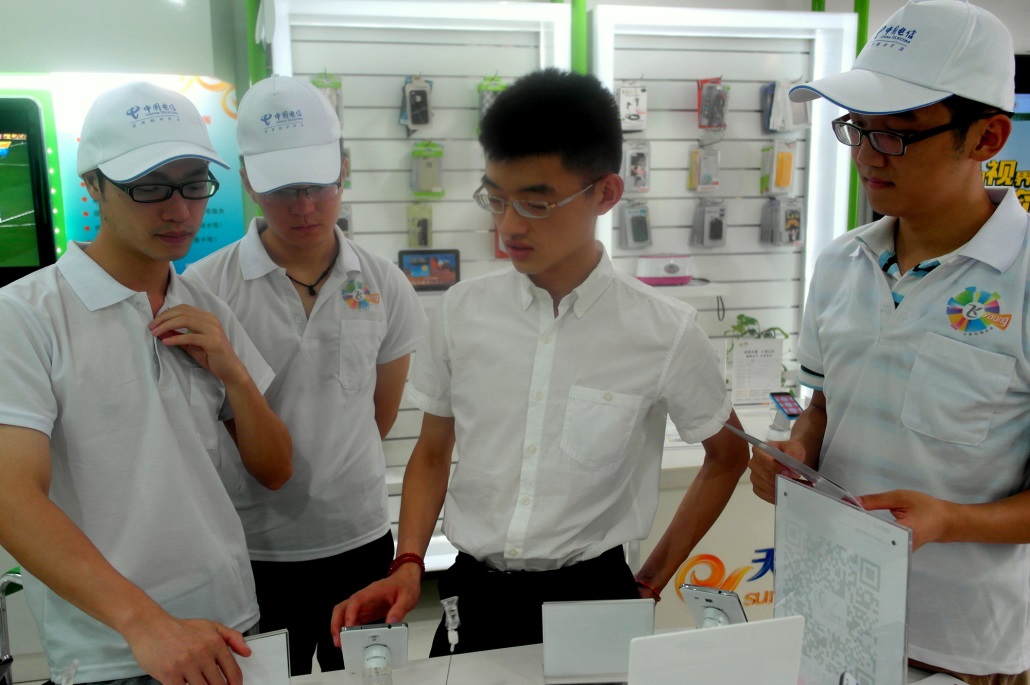 智慧电信调查方面,实践团一行在计算机学院党总支副书记虞晨洁的带领下,深入中国电信上海长宁区古北分局,实地考察中国电信基础知识、业务内容,现场体验中国电信天翼专营店的智能移动终端业务产品,并了解天翼4G、天翼领航A9智慧企业套餐等信息化最新产品,进一步加深对中国电信信息化业务产品的品牌认知。