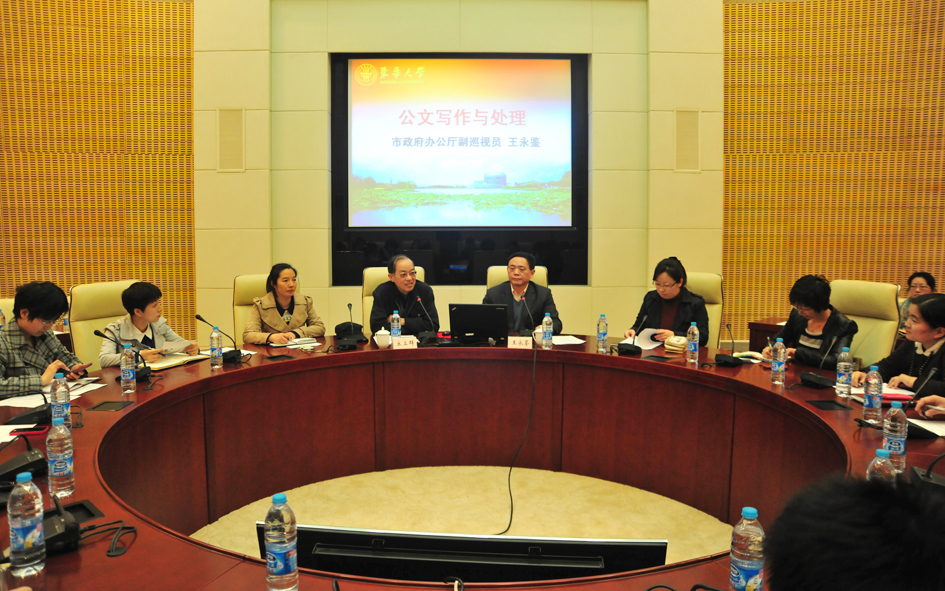 4月15日,上海市政府办公厅副巡视员王永鉴应邀为我校青年骨干培训班学员作“公文写作与处理”专题讲座,副校长宋立群出席并主持。各学院、职能部门办公室主任及信息员等参与培训。