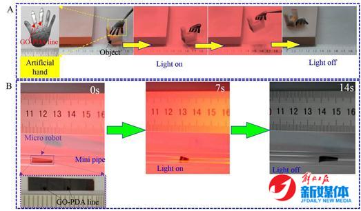 A图:一只石墨烯纸制作的人工手在光源明灭中抓取了小物件。