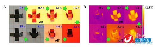 实验中,一张十字形的石墨烯纸在不同光热条件下用2.6秒折成一个纸盒,右图显示温差接近30摄氏度。