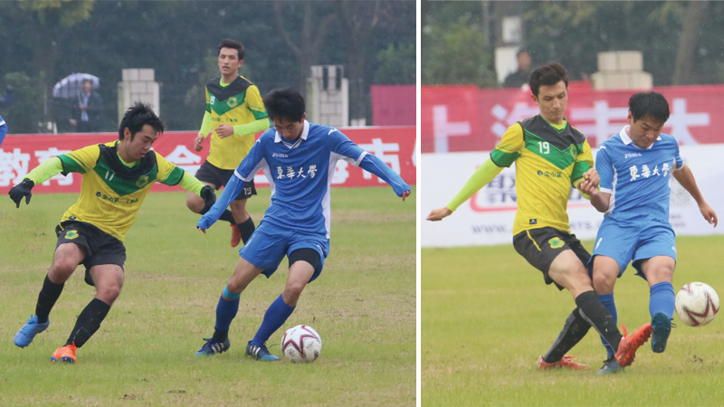在校园组决赛中,我校足球队历经八轮赛事,保持不败战绩,在半决赛上淘汰上海电力学院后闯入决赛。决赛中,双方球员全力拼搏,战况胶着。比赛前20分钟我校足球队虽占据主导位置,但遭遇对方门将顽强抵挡,化解了我方多次颇具威胁的射门。第28分钟,我方球员获得角球机会,混战中6号队员白翔在对方封堵之前抓住机会率先攻进一球,为我方抢占了先机。随后华东政法大学队多次反攻并未成功。第85分钟,我方8号球员黄敬凯一记远程射门为球队再添一分,为我方锁定胜局,成功卫冕。