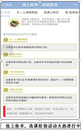 “线上抢书·选课经验放送”活动展开以后,收到了同学们的广泛好评,同学们参与度及积极性都非常的高,许多种类的书在很短的时间内被一抢而空,还有很多同学遗憾自己未能抢到书。