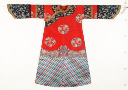 此次30件珍贵清朝闺秀服饰文物的展出直观再现了服饰历史发展过程。以本次展览中的一件红色缎地刺绣披肩领女龙袍为例,袍服颇为宽大,鱼肚袖,披肩领,腋下系带。面料用红色缎地,绣龙纹、云纹、暗八仙纹、海水江崖纹,下幅海水中绣狮子纹一对,水面上盘金绣鹤鹿同春纹,披肩领用白色缎地,绣四季花卉纹。此件女龙袍款式上与明代女子穿用的大袖衣颇为相似,从传世的清代人物画像中也可见汉族女子穿用此类龙袍。因而专家推测,此衣为汉族女子穿用,体现了清代满汉服饰的并存。