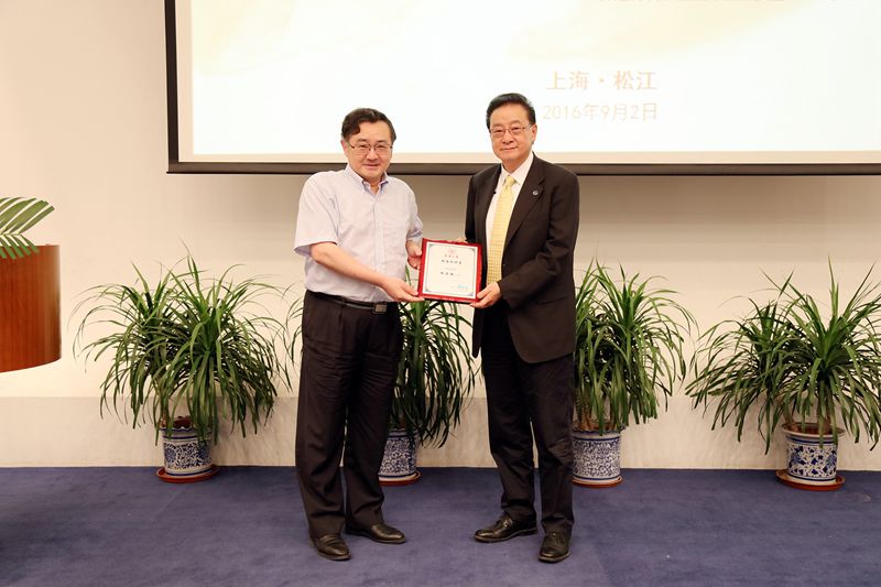(蒋昌俊校长为程正迪先生颁发嘉宾奖牌)
