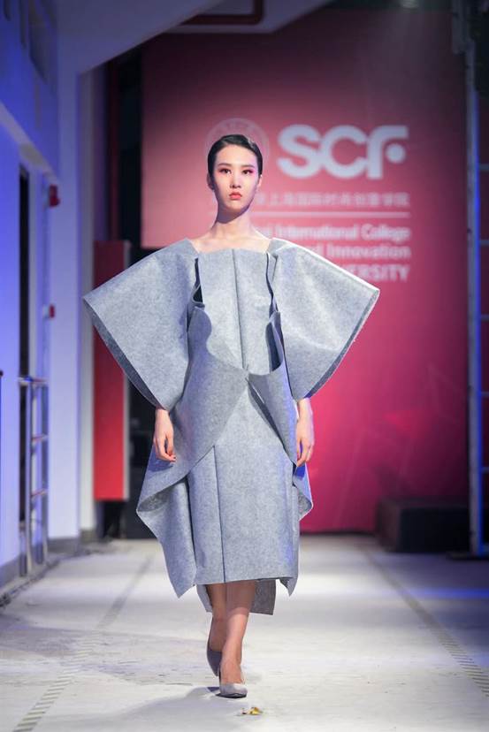 本次服装创意作品发布会由时尚室内设计专业学生参与舞台设计,33套服装创意设计作品来源于SCF服装创意设计学生项目制课程《多样化设计》《人体建构》课程作业及与刘海粟美术馆合作的奥地利时装艺术创意工作营作品,展现了学院项目制课程设计注重理论与实战相结合、力求融合多元文化研究、强调时尚设计社会责任的治学理念。2014级学生沈质颖的作品灵感来源是克林姆特的画作,黑色皮衣略带颓废加上隐约金色浓艳的色彩,表达了对与外在表现不相称的严肃和忧伤内涵的克林姆特作品的理解;2015级留学生阿方索(Alfonso)的作品就是一件灰色超大号外套,从和服的基础版型发展而来,背后以花为主题进行塑型,表达了对服装设计廓形的理解……这些作品正是依托于学院每学期开设三门这种侧重设计不同方面的项目制课程,通过时尚品牌实战项目与国际化的师资对接,使学生从理论知识到动手实践再到成果汇报实现学习闭合循环,培育学生国际化的系统研究能力、创作能力与应对市场动态变化的能力。