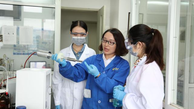 (陈红老师(中)给学生讲解实验仪器的使用方法)