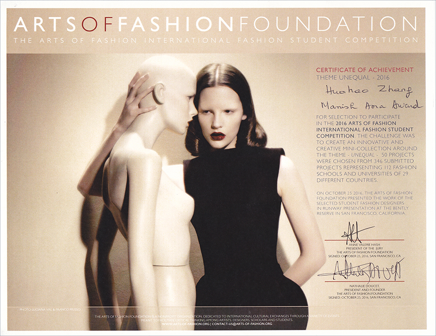 日前,在美国旧金山刚刚结束的2016年国际时装设计大赛(ARTS OF FASHION FOUDATION COMPETITION,简称AOF)上,我校服装学院两位新锐设计师(2016届毕业生)设计作品集亮相大赛并进行了服装动态表演,其中,卢政设计作品《犯罪现场》获Maison Lesage Award,张华皓设计作品《废土》获Manish Arora Award,指导教师为服装学院周洪雷、茅丹。