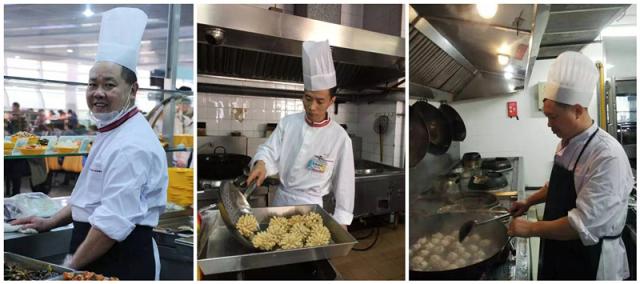 (获奖厨师李军、李刚、曹海兵(从左至右)为师生精心烹制菜肴)