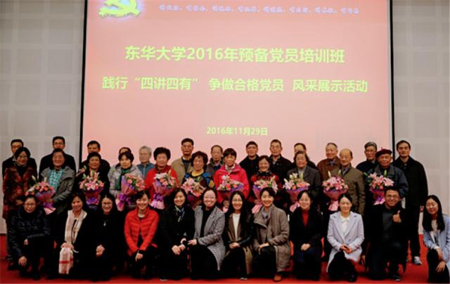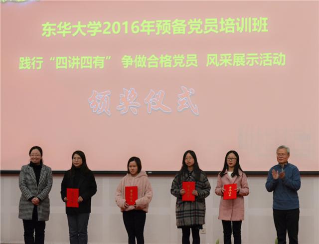 本次展示活动围绕学习党章党规、学习系列讲话,重点学习习近平总书记“七一”重要讲话,结合纪念红军长征胜利80周年,鼓励预备党员从“学党章、忆党史、学讲话、议时事”等内容入手,以演讲、朗诵、PPT展示、情景剧表演等形式分享学习体会和实践收获。纺织学院、服装学院、管理学院、外语学院以红色经典阅读、微党课、志愿服务等为载体,引导预备党员以学促做,做到学做结合;环境学院、计算机学院、人文学院、理学院结合学院特点,发挥学生党员在环境保护、精准扶贫、入伍当兵、校园文明方面的先锋模范作用;机械学院、信息学院、化工生物学院、材料学院预备党员通过组织专题讲座、学习交流、观看电影《勇士》、重走长征路等形式,弘扬长征精神,立志用青春梦托起中华民族伟大复兴的中国梦。伴随“践行‘四讲四有’,争做合格党员”风采展示活动的举行,本期预备党员培训班也随之落下帷幕。