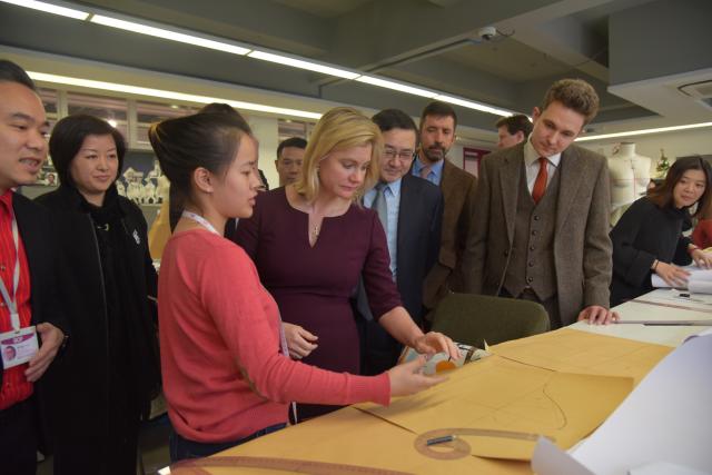 参观走访中,学院所采取的“飞行学者+行业领袖+校内专家”跨国跨界师资团队建设机制引起了贾斯蒂•格里宁一行的关注。以本科“服装与服饰设计(服装创意设计方向)”专业为例,这是一门与爱丁堡大学合作开设的专业,每学期,爱丁堡大学都会指派专业教师来我校承担部分教学任务,并负责指导学生科研项目。除此之外,学院还同期配备行业专家、兼职教授、校内专家等专业师资,中英双方共同开展教育教学。