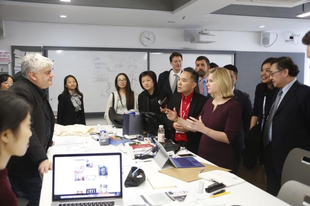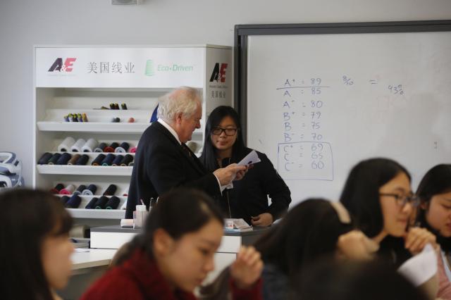 贾斯蒂•格里宁一行来到了SCF学院专业教室,并现场与师生互动交流。在一年级教室中,服装创意设计专业学生正在进行《视觉文化》课程,来自英国的授课老师迈克尔•汉恩(Michal Hann)通过案例分析,为学生们讲解视觉艺术的中西方异同,促进学生多元文化思考。迈克尔•汉恩在SCF学院任教已有三年,每年承担两门授课任务。他认为,在中国大学授课,不仅让他有机会传播英国文化艺术,同时,中国文化和中国高校也对他的视野和知识系统产生影响,而这些影响对他更好地从事教育教学和创作很有启发。贾斯蒂•格里宁的到来让迈克尔•汉恩很激动:“没想到能在异国他乡见到我们的教育国务大臣,我感到特别荣幸”。