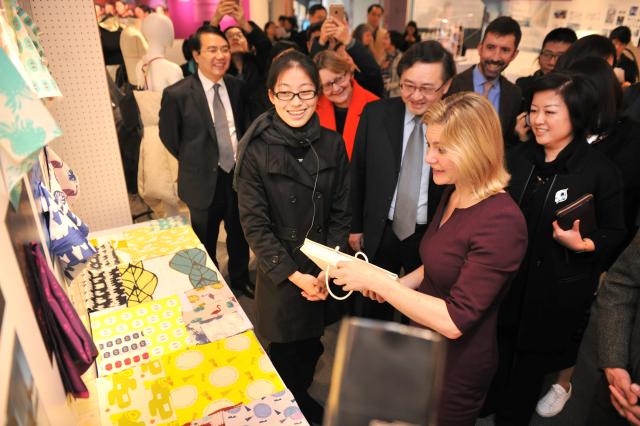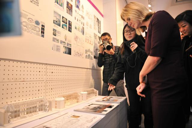 贾斯蒂•格里宁一行来到逸夫楼一楼展厅,这里正在进行的是我校学生作品服饰展,作品都是学生的课程作业,而这些课程均是与爱丁堡大学合作共建的专业课程。贾斯蒂•格里宁驻足在一件时尚创意展品前,原来这件关于T台设计的展品,运用了再现爱丁堡老城街景的手法——既有中英文化元素的交融,又有传统与时尚的碰撞,作品创作者、上海国际时尚创意学院时尚室内设计2016级学生梁好说:“学校的时尚创意教学空间不拘泥于校园,老师们把企业、艺术展览等实战场所也作为我们学习时尚创意设计的课堂,这有助于我们把文化学习收获实物化,理论与实践相互交融。”贾斯蒂•格里宁对这样的教育教学方法十分赞同。