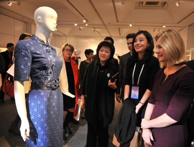 逸夫楼展厅中,海派旗袍展同期展出,贾斯蒂•格里宁一行驻足并连连称赞。展出的旗袍作品由我校、爱丁堡大学以及社会知名服装企业共同设计提供,其中既有以“金、木、水、火、土”为主要设计元素的商业装旗袍,也有来自高端品牌的定制旗袍,展现不同历史时期海派旗袍的流行风貌和文化艺术特色,重在表现中国传统文化艺术与当代时尚的融合。值得一提的是,该系列海派旗袍展于今年8月首次在英国展出,亮相于2016爱丁堡艺术节,受到当地民众和媒体广泛关注,参观者惊叹中国海派旗袍,“太漂亮了,中国服饰背后的历史魅力令人触动,中国传统文化博大精深。”