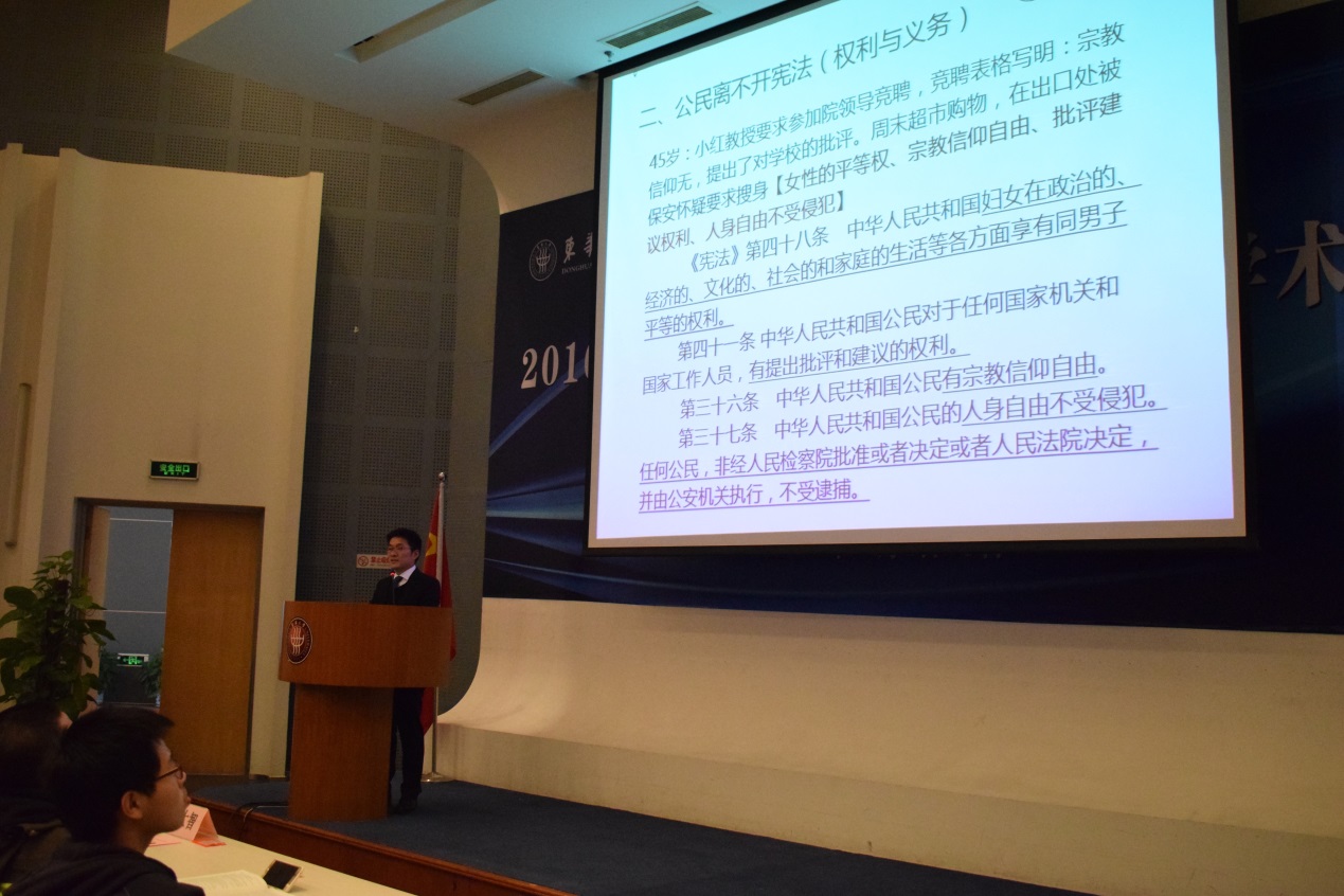 今年是“七五”普法启动后的第一年,在第三个国家宪法日来临之际,12月1日,由校法务办公室、党委宣传部共同主办,环境学院、人文学院承办的国家宪法日主题报告会暨宪法宣誓仪式在松江校区举行。