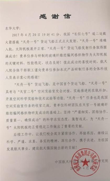 (中国航天科技集团公司八院第一时间发来感谢信)