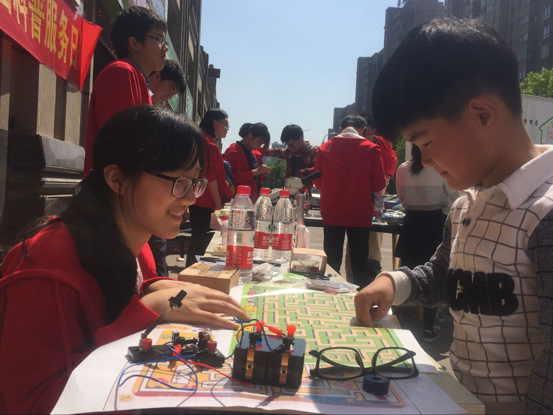 本次科普活动主要面向蜀山区中小学生,大学生科普志愿者精心准备了适合青少年的科普服务内容,吸引了许多同学前来参与。生活化学咨询服务部志愿者在现场示范的过程中,将手工皂制作的原料、过程以及原理娓娓道来,居民们在收获知识的同时也得到了一份精美的手工皂;家庭节能咨询服务部的志愿者将科学魔术盒和智力扣项目进行创意改造,寓教于乐,吸引了小朋友们的动手参与,锻炼了他们的耐心与细心;社区环境检测服务部的服务项目则由食醋与小苏打的“冒泡反应”和显微镜下微观世界组成:通过加入不同颜色的色素产生五彩的“喷泉景象”,让“冒泡反应”化学原理的介绍更加生动;信息技术服务部的全息投影和有趣的磁铁迷宫项目同样吸引了一大波前来体验的居民;家居机械产品及设计应用服务部展示的机器人“小金刚”以及用火柴制作的小火箭,更是让居民们惊奇不已,纷纷加入学习和体验。