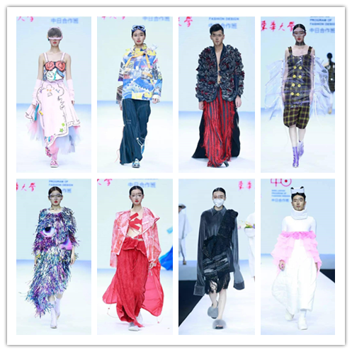 在“上场白、下场白”主题下,毕业生们对“东方与西方”“传统与创新”“趣味与艺术”等课题,进行深入思考和探索。比如在“东方与西方”课题中,探索如何以西式结构创新表现东方内敛与留白,以及传统戏剧唱段格律及起伏;在“传统结构与素材创新”课题中,尝试将纸感、PVC等新型材料与传统和服、武士等服饰元素相结合。而参与“趣味与艺术”课题的同学们,则着眼于新一代消费群对服装趣味性的需求,将日常生活用素材进行再造和创新,如有以保温涂层材质来表达对未来“衣食”行为的畅想,以流行拼豆游戏手作素材来表达游戏艺术、趣味服装的概念。同时在此课题探索中,不少学生进行了前期原创性要素的开发,如作品《梦》的手绘形象来自于作者原创插画绘本人物形象,借助纽扣做头,将二维的图案变成三维的结构;作品《FACE TO FACE》,则是在手绘面部肌肉及表情的图案基础上,以多色吸管进行面部和表情的“3D”塑形。
