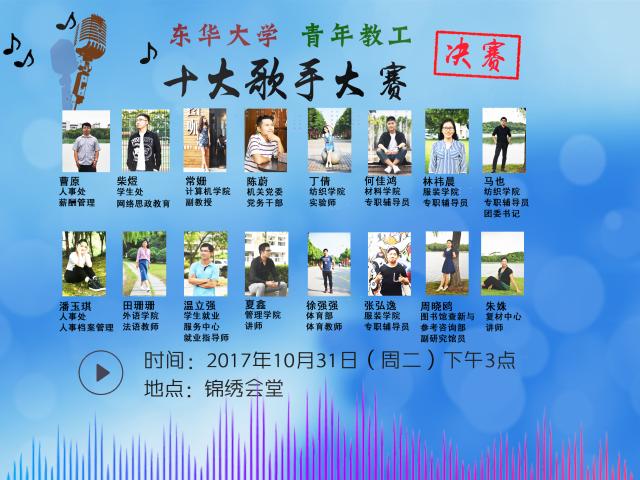为庆祝党的第十九次代表大会的胜利召开,增强教师之间以及师生之间的了解,发现优秀青年教师人才,校工会、校团委、校青年教师联谊会于2017年5月开始举办青年教工演唱比赛,经过初赛选拔,现有16名老师进入决赛。