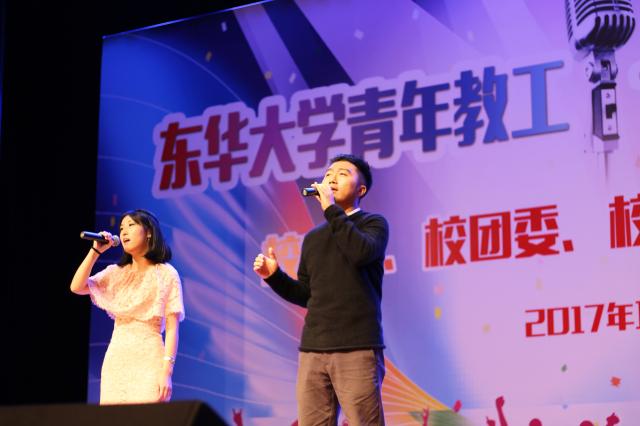 决赛分对手PK赛和十强排位赛两轮进行。第一轮,抽签配对的两位选手合作完成一首歌曲,评委根据表现选出10名选手进入第二轮比赛。《你最珍贵》《听你说》《风吹麦浪》《当你老了》《十年》《一生有你》《贝加尔湖畔》等耳熟能详的作品,展现了我校青年教工的良好风貌,给现场观众带来了视听双重享受。经过第一轮的较量,计算机学院常姗、体育部徐强强、图书馆周晓鸥、管理学院夏鑫、服装与艺术设计学院林祎晨、服装与艺术设计学院张弘逸、材料学院何佳鸿、纺织学院马也、复材中心朱姝、学生处柴煜等十名选手进入了第二轮的比赛。《追梦赤子心》《以人民的名义》《春风十里》……一首首表达我校青年教工真情实感的歌曲,让人鼓舞振奋,心潮澎湃,唱出了东华青年教工对祖国的美好赞美和祝福。经过激烈角逐,学生处柴煜获得冠军,服装学院张弘逸、林祎晨分获亚军、季军。与会领导和嘉宾为获奖选手们颁奖。
