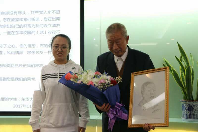 仪式上,发展联络处处长瞿斌为潘寿民教授颁发捐赠证书。潘寿民教授、纺织学院党委副书记刘雯玮、学生处学生资助管理中心主任李静共同为2017年潘寿民教育基金获得者颁奖。刘雯玮代表学院致辞,对潘寿民教授拿出退休金设立教育基金的表达感谢,为潘老退休后一直坚守在育人一线、传播大爱的义举感动,并勉励大家要懂得感恩。潘寿民助学金获得者赵泽阳、奖教金获得者冉红卫作为获奖代表发言。纺织学院柯倩兰主持仪式,并介绍了2017年潘寿民教育基金的评定流程。纺织学院学生代表为潘寿民教授送上了具有特殊意义的礼物,一幅学生为潘教授专门做的肖像画,以及一封饱含感恩之情的感谢信。