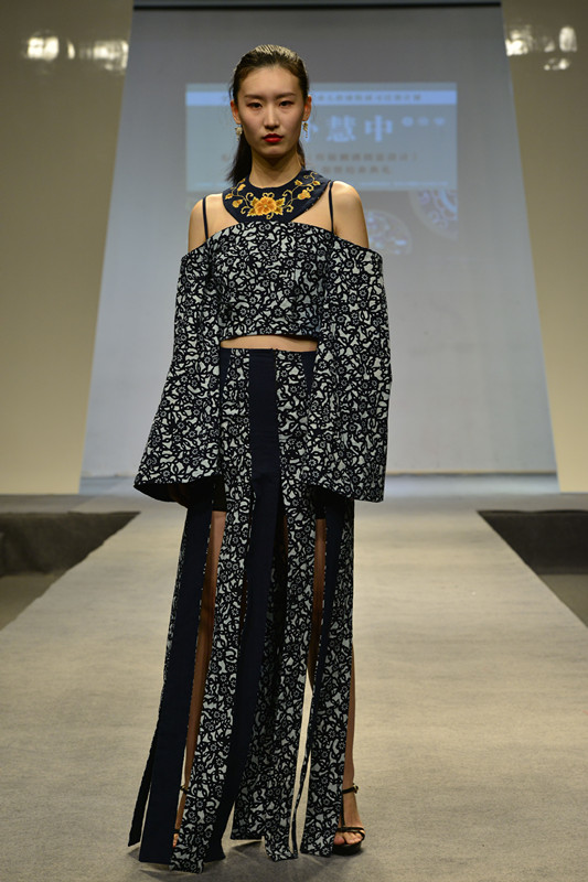 参加此次研修班的学员们通过一个月左右的理论学习和创意实践,不仅开阔了眼界,提高了自身的艺术素养和审美能力,更加提升了技艺创新的能力。在动态秀的创意展演中,学员们在T台上亲自演绎了独具特色的民族服饰,淳朴与热情的背后可以感受到传统文化的魅力和感染力。展示的服装色彩以传统红、蓝、黑色为主打,配以局部的黄和粉色点缀,短卦搭配百褶裙等多种服饰,绣有各式各样的民族图案纹样,且技法各异,很多都需花费几个月甚至几年时间精心制作而成。除了精致特色的民族服装,各式各样的头饰和配件也充分地展现出独有的民族韵味,绚丽多彩的服饰造型和内涵丰富的服饰图案也传递着民族文化和服饰艺术。