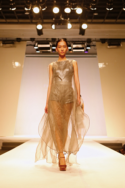 变奏上海——变形旗袍系列设计灵感来源于上海生态自然与建筑的关系,以解构主义服装造型设计手法,结合记忆金属丝的通电复原造型的特性,在传统旗袍的基础造型上集成变形、变色的科技元素,创造出奇幻的服装造型变化的效果。