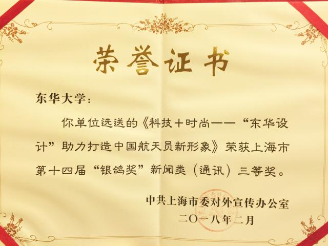 上海市对外宣传作品(项目)评选活动、第十四届“银鸽奖”揭晓,我校新闻作品《“东华设计”助力打造中国航天员新形象》获三等奖,是新闻类获奖单位中唯一一所高校。