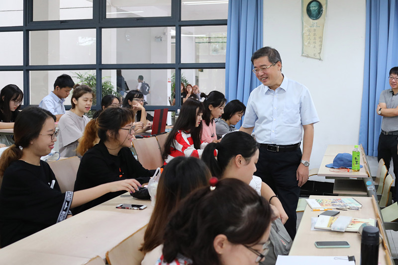 在莫伟平老师讲授的《设计速写》课堂,朱民悉心了解教学准备情况,倾听任课教师对学校教学管理和服务的意见建议。他强调,要加强和改进美育教育,探索构建以审美和人文素养培养为核心、以创新能力培育为重点的美育课程体系,并叮嘱相关部门要从师生的实际需求中把脉教学改革的信号,一切从有利于教师“教”、学生“学”的角度出发,不断优化选课排课、教学资源配置、教育技术服务以及后勤保障等工作机制,以高质量的教学管理和服务支撑高水平本科教育。