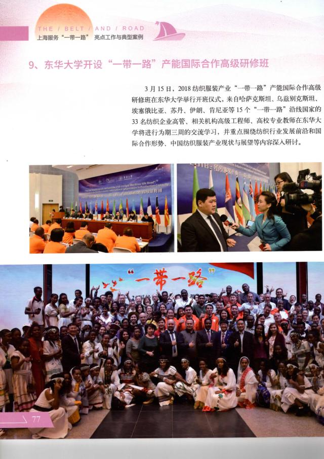 “一带一路”搭建起政产学研联合体。除了为“一带一路”建设输送大量的人才,学校对接《上海服务国家“一带一路”建设发挥桥头堡作用行动方案》,在纺织产业的产能国际合作领域与东方国际集团等知名纺织企业深入合作。2018年9月,我校与东方国际集团合作设立纺织“一带一路”教育培训基地(非洲)在埃塞俄比亚首都亚的斯亚贝巴成立。该合作项目得到市政府的高度重视,翁铁慧副市长出席揭牌仪式并为教育培训基地的后续运行提出了具体要求。