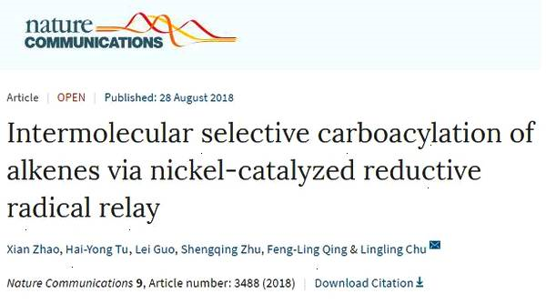 储玲玲教授课题组通过利用弱相互作用导向的镍催化自由基接力还原偶联策略,成功实现了非活化烯烃的三组分碳酰化反应。该方法利用自由基加成到烯烃形成烷基自由基,随后与酰基镍发生交叉偶联,一步高效构建两个碳--碳键,同时利用烯烃底物的弱导向基团实现了优秀的化学选择性和区域选择性。该反应条件温和,具有优异的底物实用性,复杂药物分子和天然产物等衍生物也能高效发生转化。利用这个新颖的催化方法,可以从简单易得的原料出发合成一系列重要的氟烷基酮化合物。该项工作为非活化烯烃的选择性官能团化提供了新的设计思路。