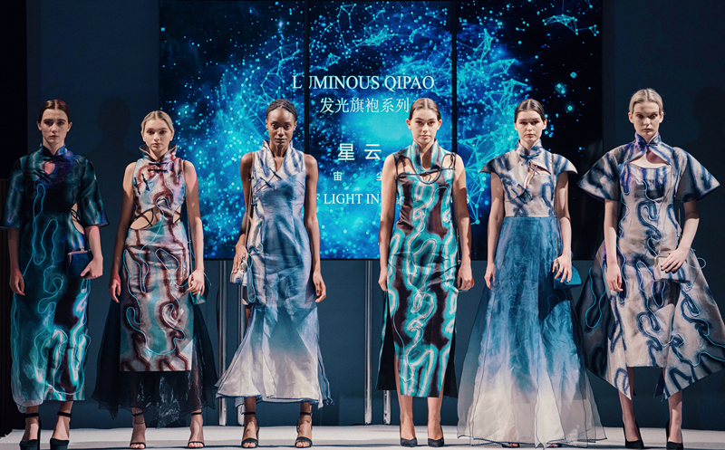 各种变色发光变形的“科技旗袍”可不仅为了好玩好看,宽色域、高强度的电致变色材料是可穿戴显示、服饰器材隐身领域急需却一直难以突破的器件体系,材料学院教授王宏志领衔研发的多材料电致变色设计体系拥有原创知识产权,可以实现多种形态、多种色彩的电致变色,变色快速且均匀。技术成功应用于“科技旗袍”变色系列2.0版本中,将只有A4纸厚度并可折叠的变色片集成到柔软贴身的旗袍面料上,让服装变色隐身成为可能。