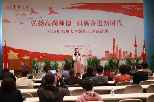 本次活动得到了全校教职工的广泛参与,各学院部门积极推荐教师代表参赛。讲演内容均为原创作品。讲演中,老师们从“弘扬爱国奋斗精神,建功立业新时代”“改革开放40周年,教育奋进正当时”“弘扬高尚师德,潜心立德树人”三个方向切入,声情并茂地讲演东华人的故事,缅怀钱宝钧等老一辈知识分子的家国情怀和奉献精神,感沐优秀教师潜心育人的感人事迹,展现了东华教师坚守讲台、铸魂筑梦、立德树人的良好形象,坚定“四个自信”、在课程思政改革中勇于创新、追求卓越的时代风貌,传递出浓浓师德正能量。
