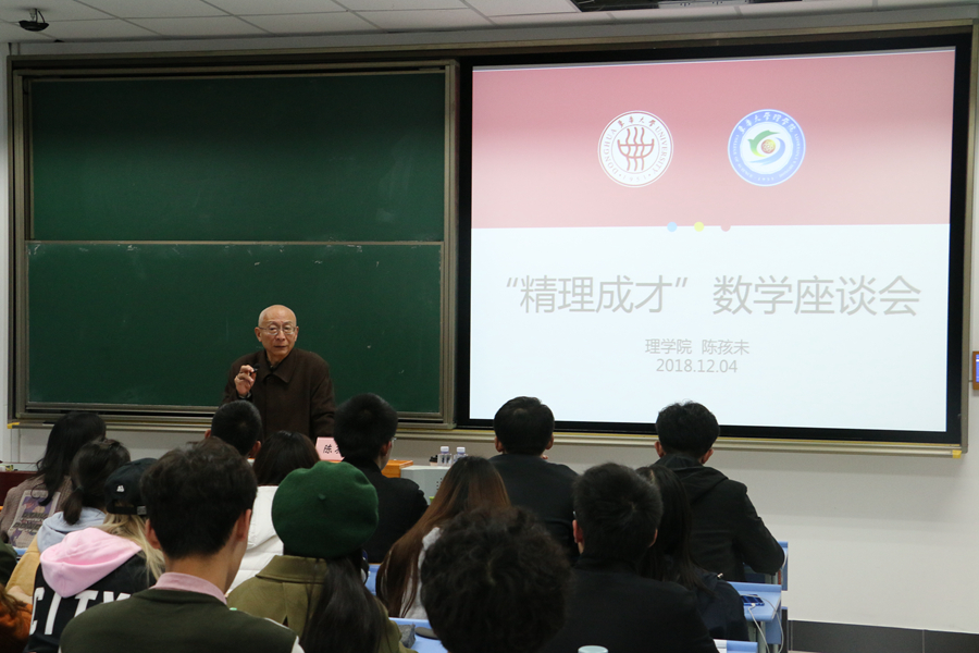 12月4日下午,理学院“精理成才”系列教育活动——陈孩未老师期中座谈会在松江校区举行,理学院2018级学生参加座谈。主讲人陈孩未老师是我校深受学生欢迎和喜爱的数学老师,他从事高等数学教学数十年,退休后仍关心学生的学习成长,现为理学院关工委老教授讲师团和教学督导组成员。