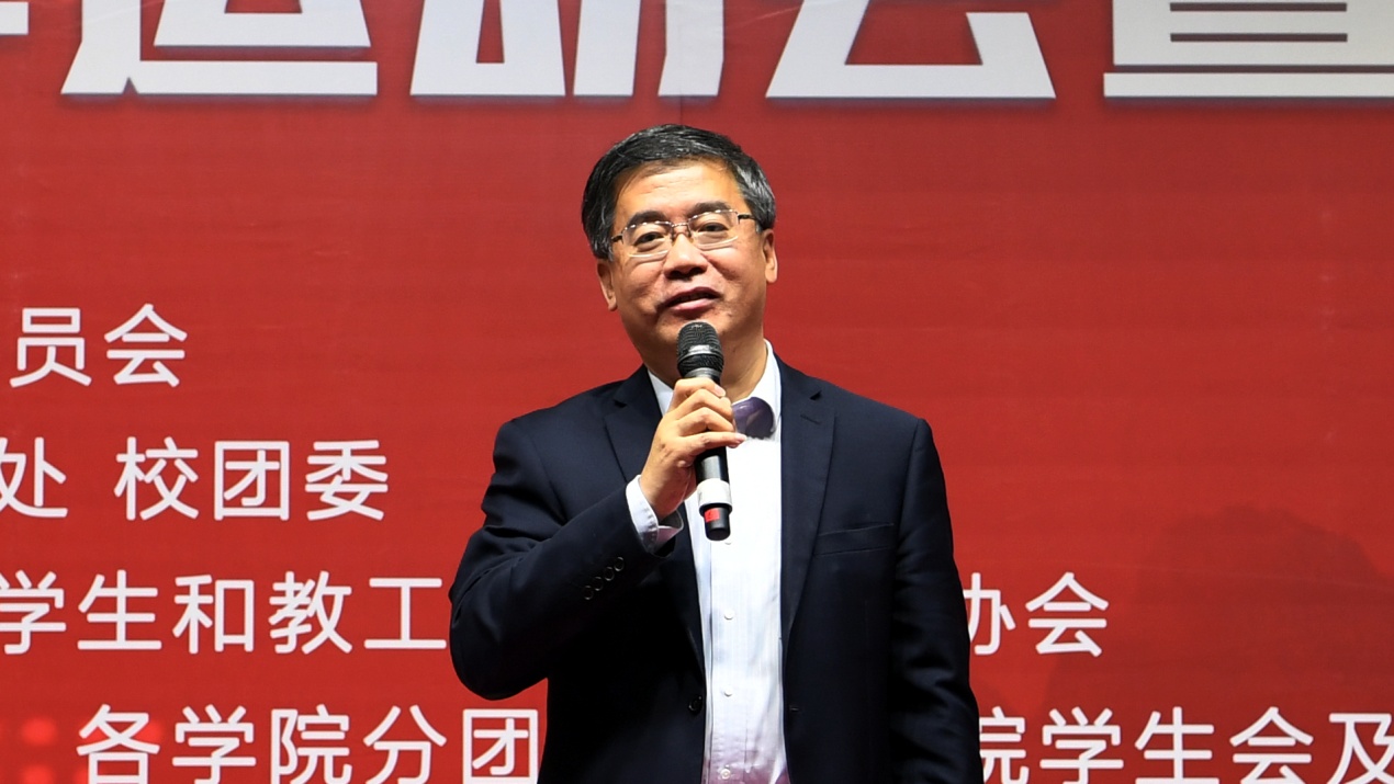 蒋昌俊致开幕辞,代表学校向运动会的召开和体育节的开幕表示祝贺,向各位工作人员、裁判员、运动员表示感谢。他指出,同学们的体质与健康关系国家和民族的未来,学校历来具有优秀的体育传统,校一年一度的运动会,不仅仅是体育竞技的盛会,更是一次对自我的挑战和超越,他希望全体运动员将“更高、更快、更强”的体育精神内化成为百折不挠的信念与理想,顽强拼搏,赛出水平,赛出风格,更希望大家在运动会这个舞台上,以奋发有为、昂扬向上的精神状态向新中国70华诞献礼!
