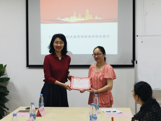 沈洁向学生代表颁发项目“突出贡献奖”“优秀成员奖”,丁怡代表学院向“校史微课”特聘讲师颁发聘书。