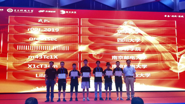 7月26至27日,第十二届全国大学生信息安全竞赛创新实践能力赛总决赛在成都举办。大赛由教育部高等教育司、工业和信息化部信息安全协调司指导,教育部高等学校信息安全类专业教学指导委员会主办,共有来自486所高校的1400多个参赛队伍的5000多名学生参与线上赛,最终80个队伍进入决赛。由计算机学院2017级本科生高新博、马靖宇、黄运发、郑伊静、朱冠宇、孔祥东组成的我校R00t-2019战队最终获全国一等奖。