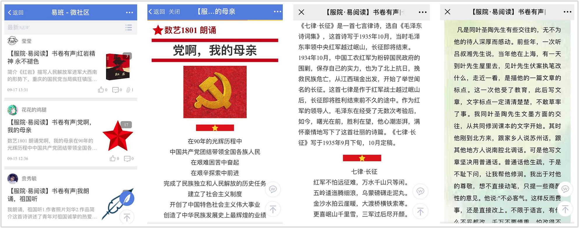 主题教育活动紧扣“我和我的祖国”主题,创新理论学习的多渠道和形式,激发青年学子自觉、自发学习的热情。易班平台打造“新时代·学习在线”系列微课,课程重点围绕习近平新时代中国特色社会主义思想和新中国成立70周年以来国家发展变化,选拔学生骨干担任微课讲师,从学生视角讲述国家的发展,诠释新时代精神。生动讲解激发了学生学习积极性和趣味性,在网络上掀起了学习的热潮。