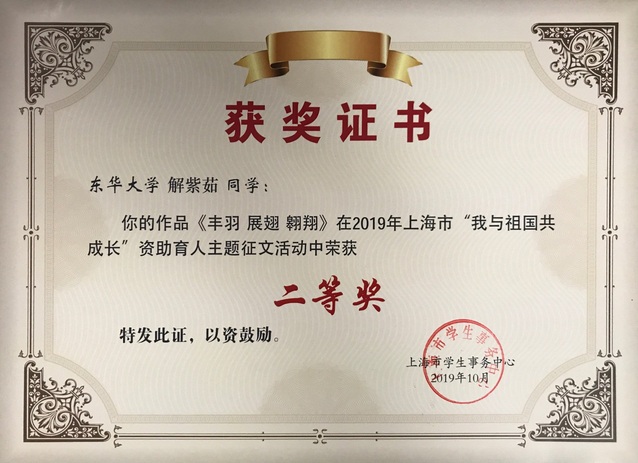 近日,从上海市学生事务中心传来喜讯,我校环境学院研究生解紫茹同学的《丰羽展翅 翱翔》和人文学院本科生孙晓冬同学的《祖国伴我成长》在上海市2019年“我与祖国共成长”资助育人主题征文活动(简称“主题征文活动”)中分获二、三等奖,我校荣获优秀组织奖。