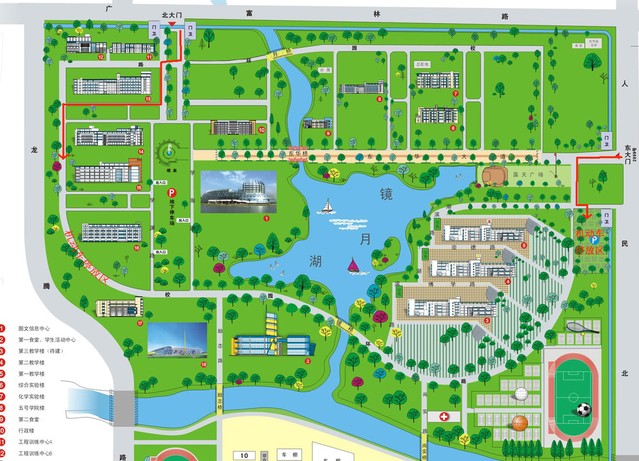 图二:红线为机动车辆进入校区后行驶路线及停车区域