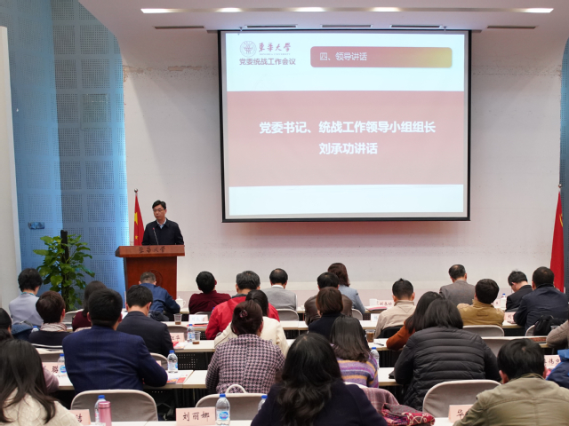 刘承功在讲话中对两年来学校统一战线开展的工作和取得的成绩表示肯定,强调要提高政治站位,深刻认识统战工作凝聚人心、团结力量的本质要求,坚持以习近平新时代中国特色社会主义思想指导统战工作新实践,引导统一战线成员更加积极主动地投身学校建设发展。针对下阶段统战工作重点任务,他指出,要强化党外知识分子思想引领,进一步坚定统一战线成员“四个认同”“四个自信”;加强党派团体自身建设,不断提升建言献策、支持推动改革发展的意识能力;加强党外代表人士队伍建设,科学统筹、合理布局人才资源,充分发挥无党派人士蓄水池作用;加强改进民族宗教工作,铸牢中华民族共同体意识,促进民族团结进步,有效防范宗教渗透和校园传教;认真做好港澳台侨工作,加强关心帮助和团结引导。刘承功强调,要积极开创学校统战工作新格局,进一步加强党的领导,健全和落实统战工作机制,不断增强职能部门和基层党组织的统战工作意识、沟通协作能力,形成“大统战”工作合力;要加强同兄弟院校、地方政府和企事业单位的交流合作,为深化学校对外开放合作、主动融入长三角区域一体化发展等发挥桥梁纽带作用。他希望统一战线工作要牢固树立大局意识和全局观念,坚定为党育人、为国育才的初心使命,努力为推进“双一流”建设、实现内涵式发展广泛凝聚共识、凝聚人心、凝聚智慧、凝聚力量,汇聚成建设“奋进东华”的强劲动力。