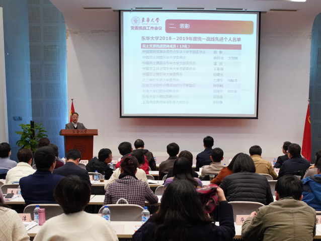 刘承功在讲话中对两年来学校统一战线开展的工作和取得的成绩表示肯定,强调要提高政治站位,深刻认识统战工作凝聚人心、团结力量的本质要求,坚持以习近平新时代中国特色社会主义思想指导统战工作新实践,引导统一战线成员更加积极主动地投身学校建设发展。针对下阶段统战工作重点任务,他指出,要强化党外知识分子思想引领,进一步坚定统一战线成员“四个认同”“四个自信”;加强党派团体自身建设,不断提升建言献策、支持推动改革发展的意识能力;加强党外代表人士队伍建设,科学统筹、合理布局人才资源,充分发挥无党派人士蓄水池作用;加强改进民族宗教工作,铸牢中华民族共同体意识,促进民族团结进步,有效防范宗教渗透和校园传教;认真做好港澳台侨工作,加强关心帮助和团结引导。刘承功强调,要积极开创学校统战工作新格局,进一步加强党的领导,健全和落实统战工作机制,不断增强职能部门和基层党组织的统战工作意识、沟通协作能力,形成“大统战”工作合力;要加强同兄弟院校、地方政府和企事业单位的交流合作,为深化学校对外开放合作、主动融入长三角区域一体化发展等发挥桥梁纽带作用。他希望统一战线工作要牢固树立大局意识和全局观念,坚定为党育人、为国育才的初心使命,努力为推进“双一流”建设、实现内涵式发展广泛凝聚共识、凝聚人心、凝聚智慧、凝聚力量,汇聚成建设“奋进东华”的强劲动力。
