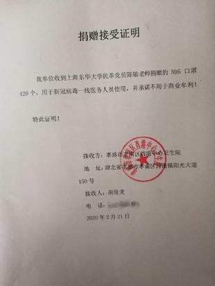 “当时,我联系了民革市委,感谢民革市委几位负责人,他们第一时间联系到民革湖北省委。考虑到当时大批防疫物资都集中捐往武汉,建议将这批口罩直接捐赠给孝感市医护人员使用。”孝感当时是湖北除武汉外疫情最严重的地区,我深感时间紧迫,当天联系顺丰,以专送渠道快递给孝感市孝南区肖港中心卫生院。2月21日,陈敏老师捐助的420只N95口罩顺利到达孝感,看着当地医院发来的信息和照片表示感谢,她那颗关切的心终于踏实了。