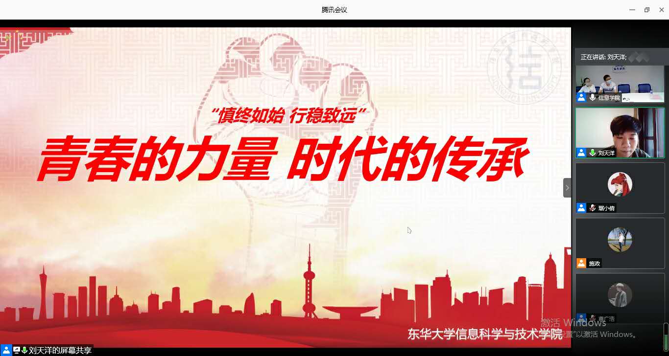 活动中,两名毕业生党员代表分享了“四史”学习主题党课,分享自己的入党初心和点滴进步,以发挥模范作用为落脚点,结合自身未来发展,就如何担当作为,将青春梦融入中国梦,牢记党员身份,更好地为人民服务进行展望。18级专硕党支部李陈新同学带大家重温百年前的五四运动,从历史中汲取奋进力量,希望能够继续发扬五四精神,坚定理想信念,担当时代责任,以实现中华民族伟大复兴为己任,将自己的人生价值融入到祖国的发展中,成长为能够担当时代复兴大任的时代新人。本科生第一党支部刘天洋同学则结合2020年新冠肺炎疫情,从国家政策、党员前辈和新时代青年党员们的使命担当出发,认为青春的力量无论在哪个年代都不容小觑,党员精神代代传承。
