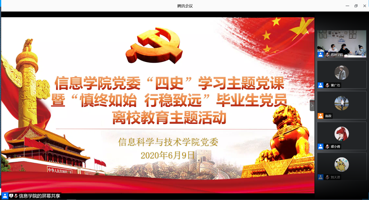 6月9日,信息学院党委以“四史”学习教育为契机,面向学院全体毕业生党员组织开展“四史”学习主题党课暨“慎终如始 行稳致远”毕业生党员离校教育主题活动。信息学院党委副书记胡海洋、学生工作办公室主任郭姗、专职党务干部夏菡斐出席活动,自动化系教工党支部全体教师党员、学生党支部全体师生党员100余人在线上参加活动。活动由学生党建辅导员施政主持。