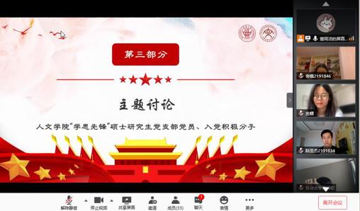 6月23日,继六月初“学习‘四史’,不忘初心,勇担使命”主题周五论坛之后,“学思先锋”硕士研究生党支部选取中国共产党在99年发展历程中抗日战争、解放战争这一特殊历程进一步深化“四史”学习教育,开展“忆革命峥嵘岁月,承新时代责任担当为主题的党日活动。校党委副书记刘淑慧,人文学院党委书记王英,院长、党委副书记张科静,党委副书记罗薇娜,副院长、党委委员吴志刚,学生办公室主任、研究生辅导员汪永安、党建辅导员穆莉出席本次活动。“学思先锋”硕士研究生党支部全体党员及19硕入党积极分子参与此次主题党日。
