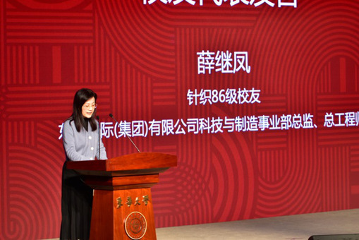 针织86级、东方国际(集团)有限公司科技与制造事业部总监薛继凤作为校友代表发言。她简要回顾了在东华的求学经历和毕业后的事业发展轨迹,表达了对母校和恩师的感激之情,并号召广大校友爱校荣校,共同擘画未来。