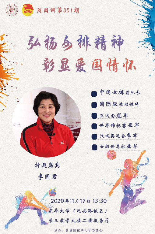 主讲人介绍:李国君,中国女排前队长,国际级运动健将,亚运会冠军,世界锦标赛亚军,汉城奥运会季军,女排世界杯亚军,被国际排联评为最佳运动员。