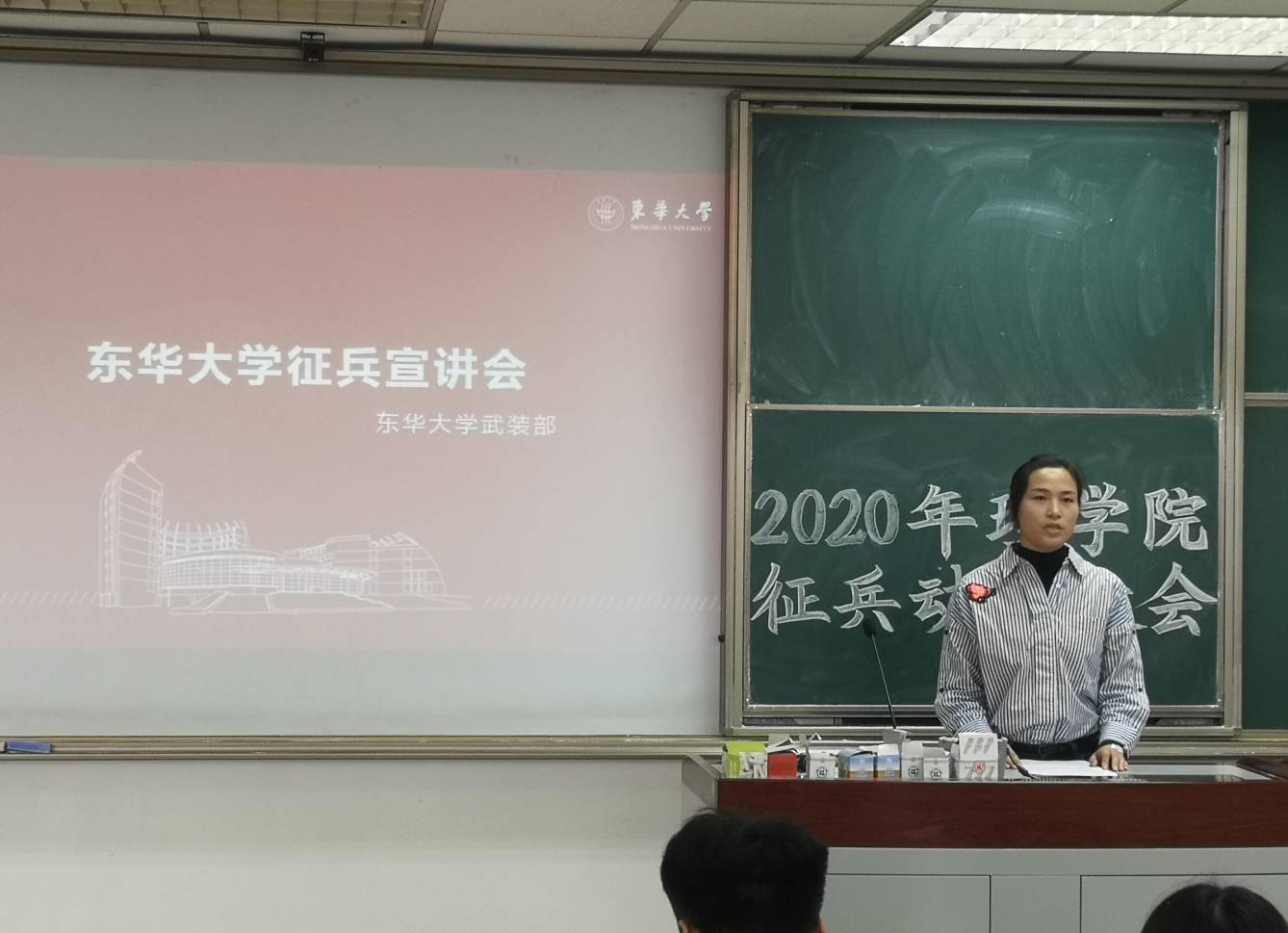 为响应国家大学生征兵工作的号召,激发大学生参军热情,11月17日,理学院在松江校区举行2020-2021年度征兵动员大会。党委武装部国防教育科姚洁,理学院辅导员马雷斯、蒋湘琼,纺织学院退役大学生士兵周稚荃、陈鼎文,理学院退役大学生士兵吴智笙,以及学院有志入伍的学生参与本次大会。